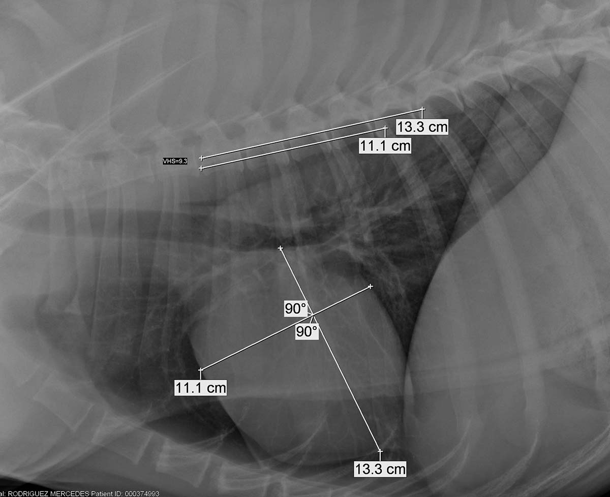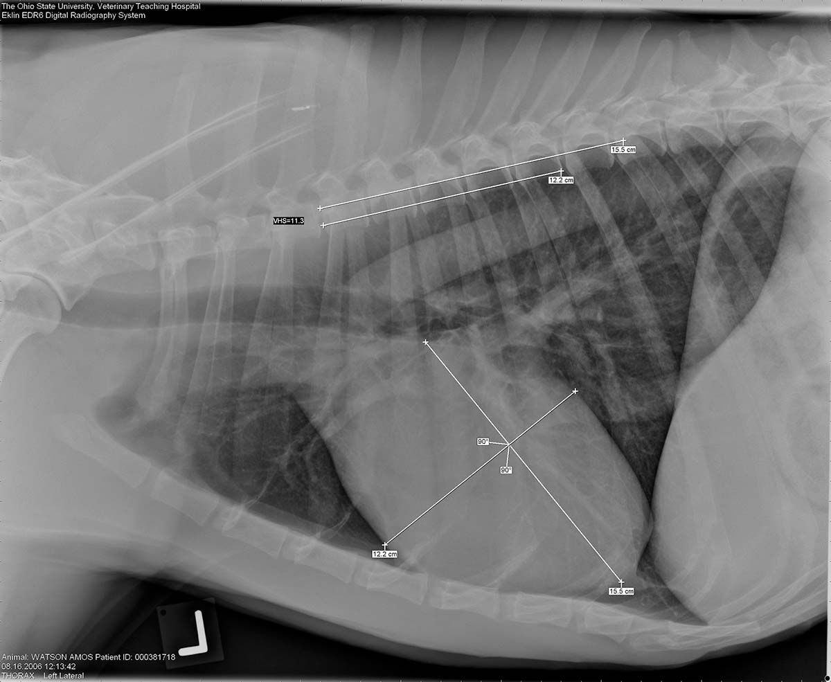 Greyhounds and several other sighthound breeds are known to have “normal” or physiologic flow murmurs. The main pump in the heart (left ventricle), is very large, and it pumps blood at higher velocity, so it swirls creating a murmur (abnormal heart sound). These murmurs are mild in nature (grade 1-2 out of 6) and are heard best over the left base of the heart (high in the left armpit) with the bell of the stethoscope. Thoracic radiographs (X-rays) and/or echocardiography (ultrasound) will help determine the actual status of the heart. Most Greyhounds have bigger hearts on radiographs, and thicker heart muscle on echocardiograms. Heart disease is also uncommon in Greyhounds, but prevalent in other sighthound breeds (e.g.; Deerhound). Below is a left lateral radiograph (X-ray) from a Greyhound (left) and a Boxer (right). The Greyhound heart is much larger.